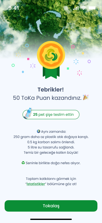 To-Ka’ya üye olarak işletmenizi çevreci bir dönüşüm hareketinin parçası haline getirebilirsiniz. Çalışanlarınıza ve müşterilerinize puanlarını hediye çeki, alışveriş fırsatı ya da bağışa dönüştürme imkânı sunarken, aynı zamanda markanızı sürdürülebilirlik ve sosyal sorumluluk alanında güçlendirebilirsiniz.